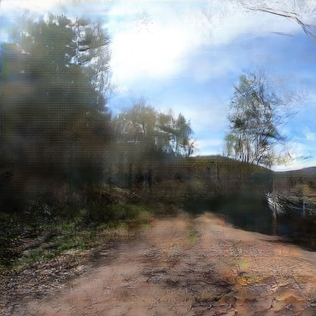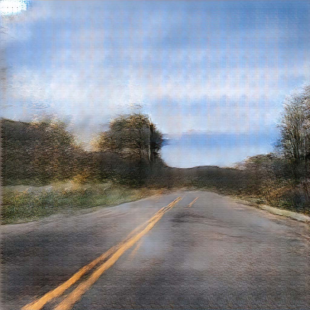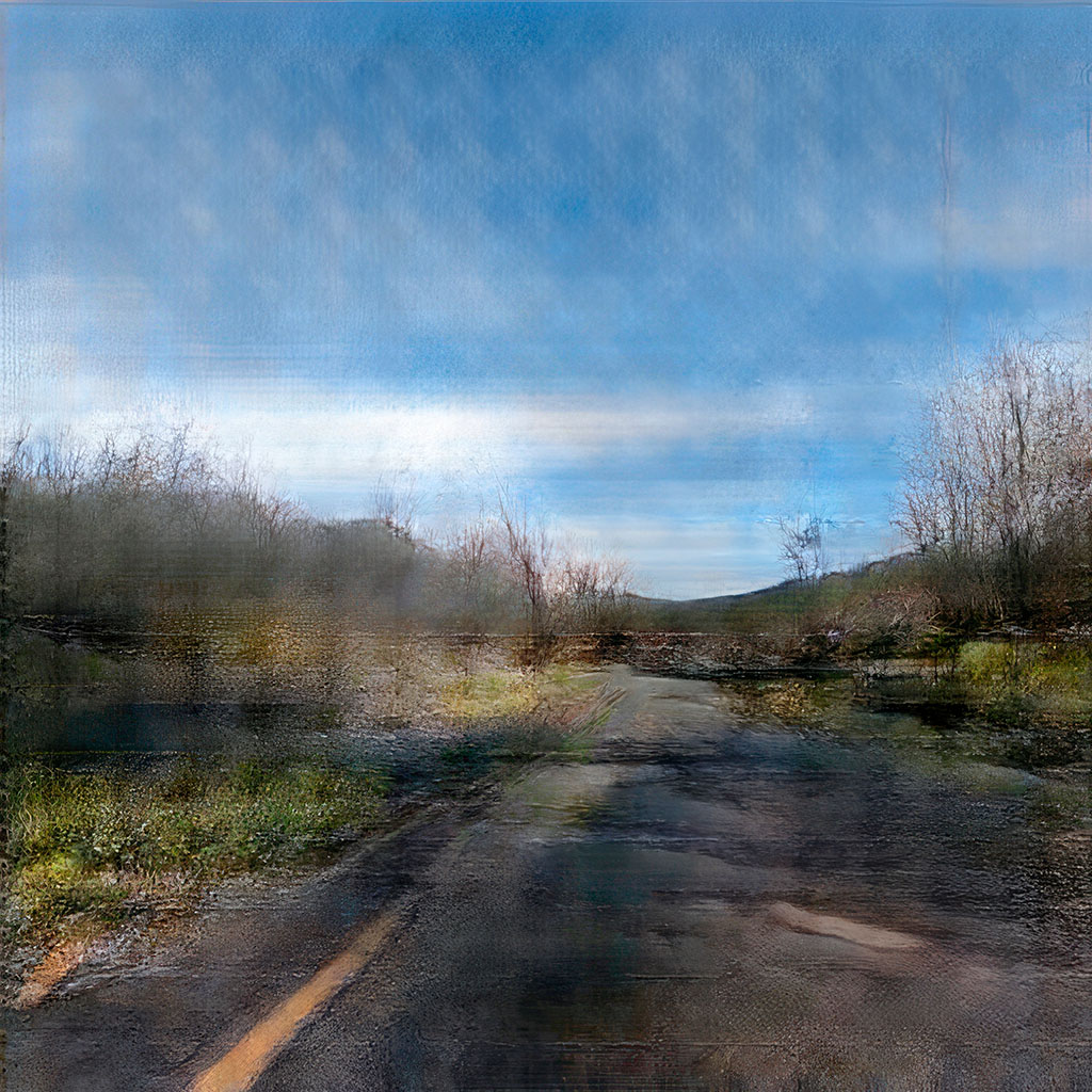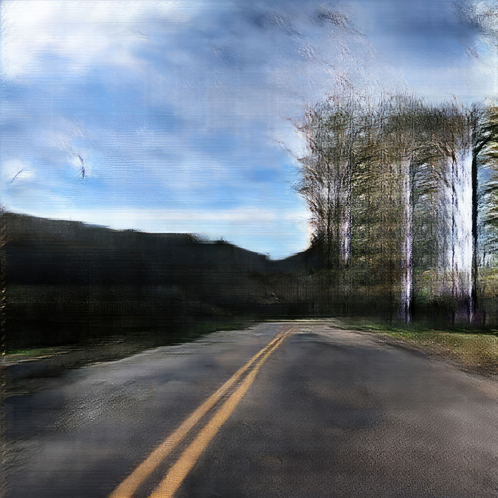 Machine learning systems construct landscape understanding through statistical pattern analysis rather than direct observation, creating synthetic natural environments that reveal algorithmic interpretation of photographic data. This work documents a specific geographic location—County Highway 5 in Bovina, NY—as training material for neural networks that generate new visualizations based on computational analysis of rural imagery. The resulting images function as evidence of artificial intelligence developing its own systematic approach to representing natural spaces.
